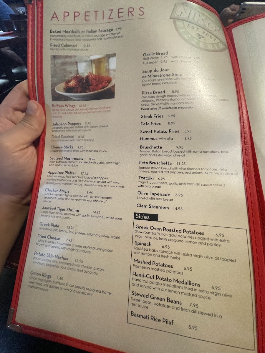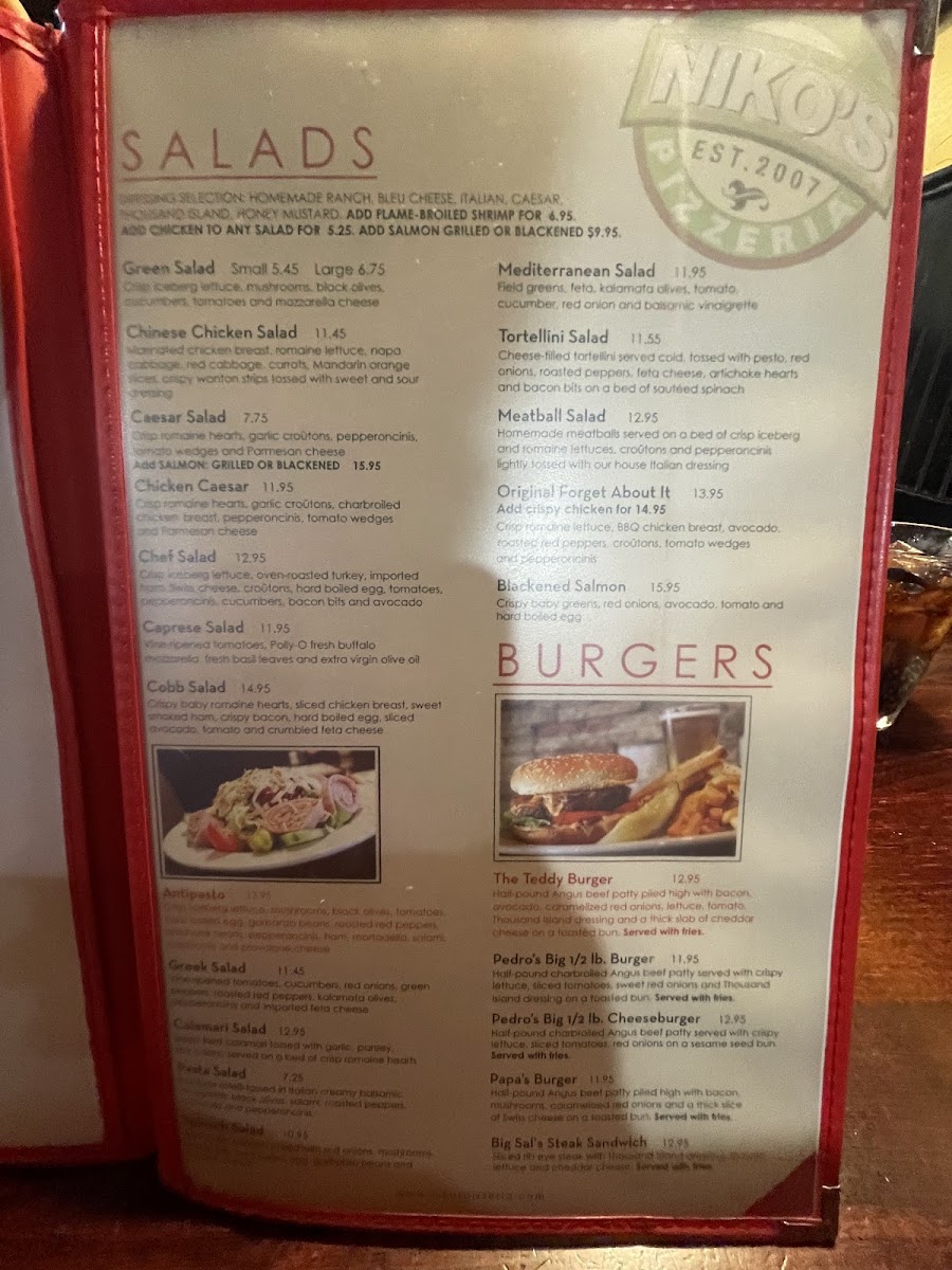 But that’s not all. Niko’s diverse menu doesn’t stop at pizza. For burger lovers, the Pedro Cheeseburger, featuring a half-pound charbroiled Angus beef patty topped with fresh lettuce, tomatoes, and crispy fries, is a hearty choice at $20.68. And if you're feeling adventurous, the Teddy Burger, adorned with bacon, avocado, and caramelized red onions, is a flavor-packed offering you won't want to miss.